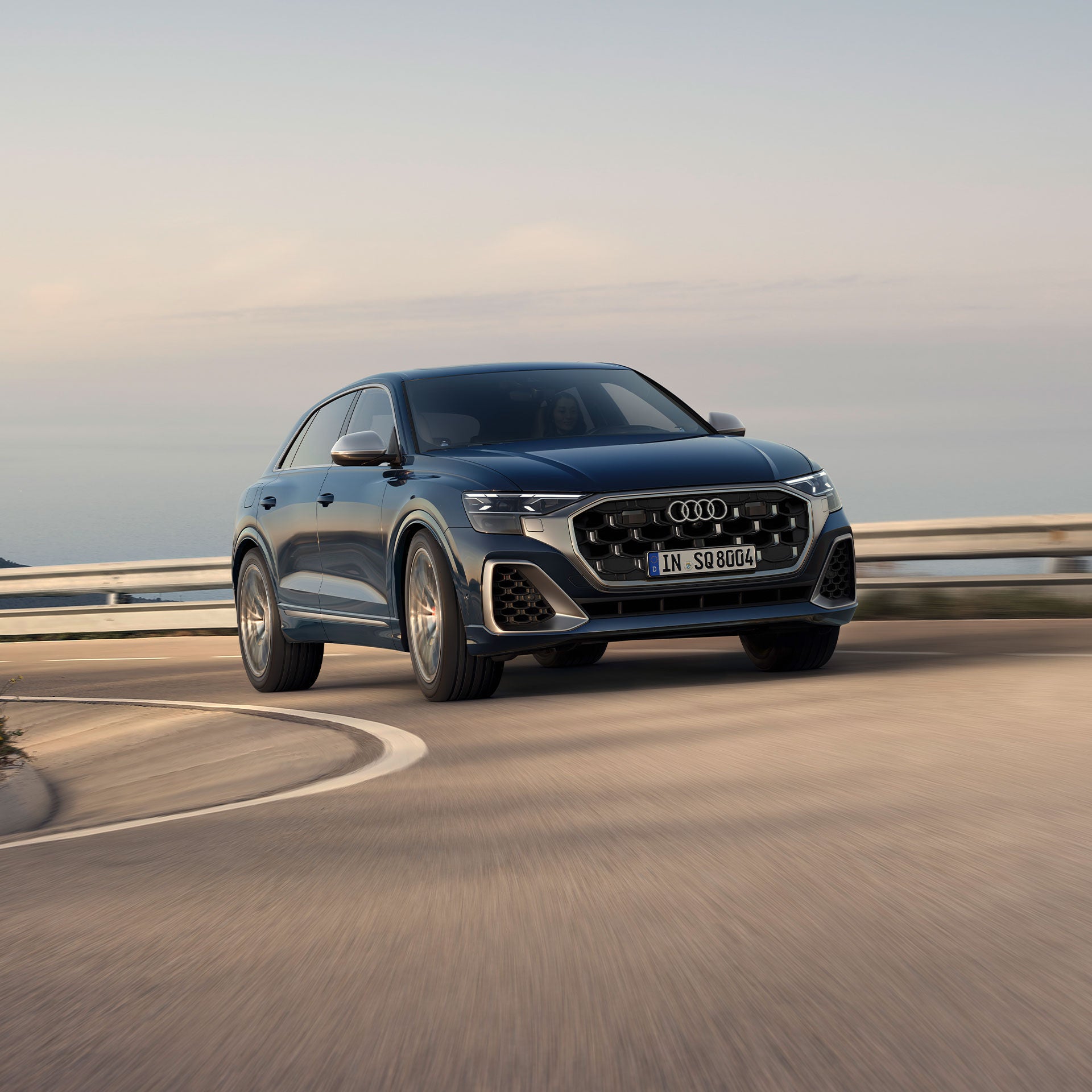 Sporty driving and high comfort are no contradiction on the Audi SQ8 SUV². With innovative suspension technologies, quattro drive and the powerful V8 TFSI engine (Fuel consumption (combined): 12.8–12.0 l/100 km; CO₂ emissions (combined): 291–272 g/km; CO₂ emission class: G), it unleashes both thrilling dynamism and outstanding stability on the road.